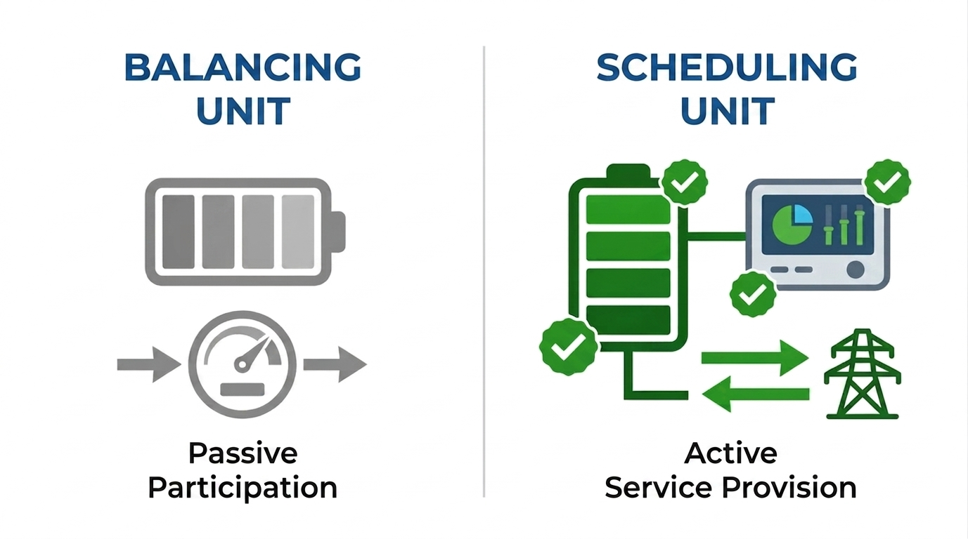 A Scheduling Unit isn’t an automatic status upon grid connection. It’s a deliberate choice to actively participate in the balancing market, bringing specific obligations — having SOWE/LFC systems, submitting dispatch programmes, and placing bids.